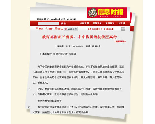 2014年3月,教育部副部长鲁昕在中国发展高层论坛上表示,全国高考将新增“技能型”模式,即培养技术技能人才的高考和现如今学术型人才的高考。现在的高校多事研究性、综合性的大学,对技能教学重视不够,千校一面,千人一面,不能够很好地与社会、企业需求相匹配。通过技术型和学术型两种模式高考培养各方面所需人才,是高考改革非常好的一面。以南京新华电脑专修学院为代表,已承载了十几年专注培养技术型人才的IT职业教育院校,与时代接轨,走在了全国高考模式的前沿,更是魅力的彰显。